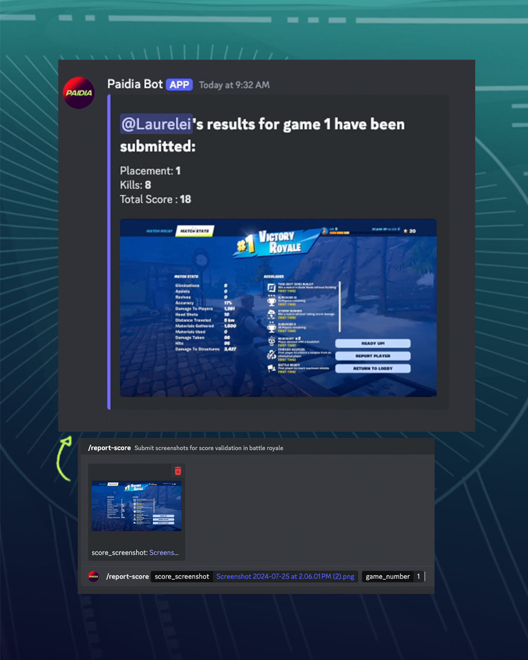 Using our AI score reporting feature to automate score reporting for battle royale. Especially helpful when competitors are playing across multiple lobbies. This feature will allow players to submit their screenshots using the /report-score command and Paidia Bot can review the screenshot and update the bracket.