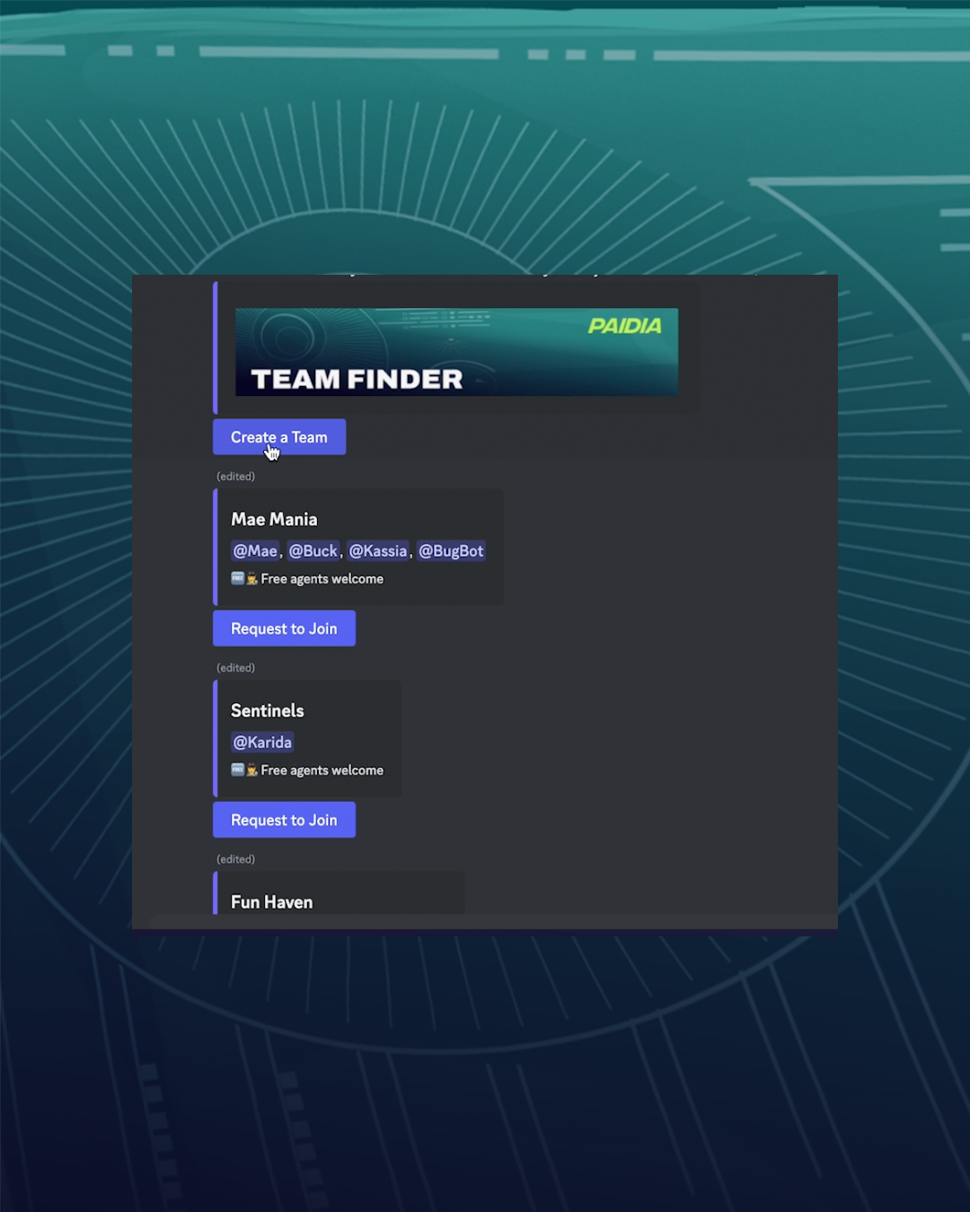 - A designated player (usually the captain) creates a team in the #teams channel.