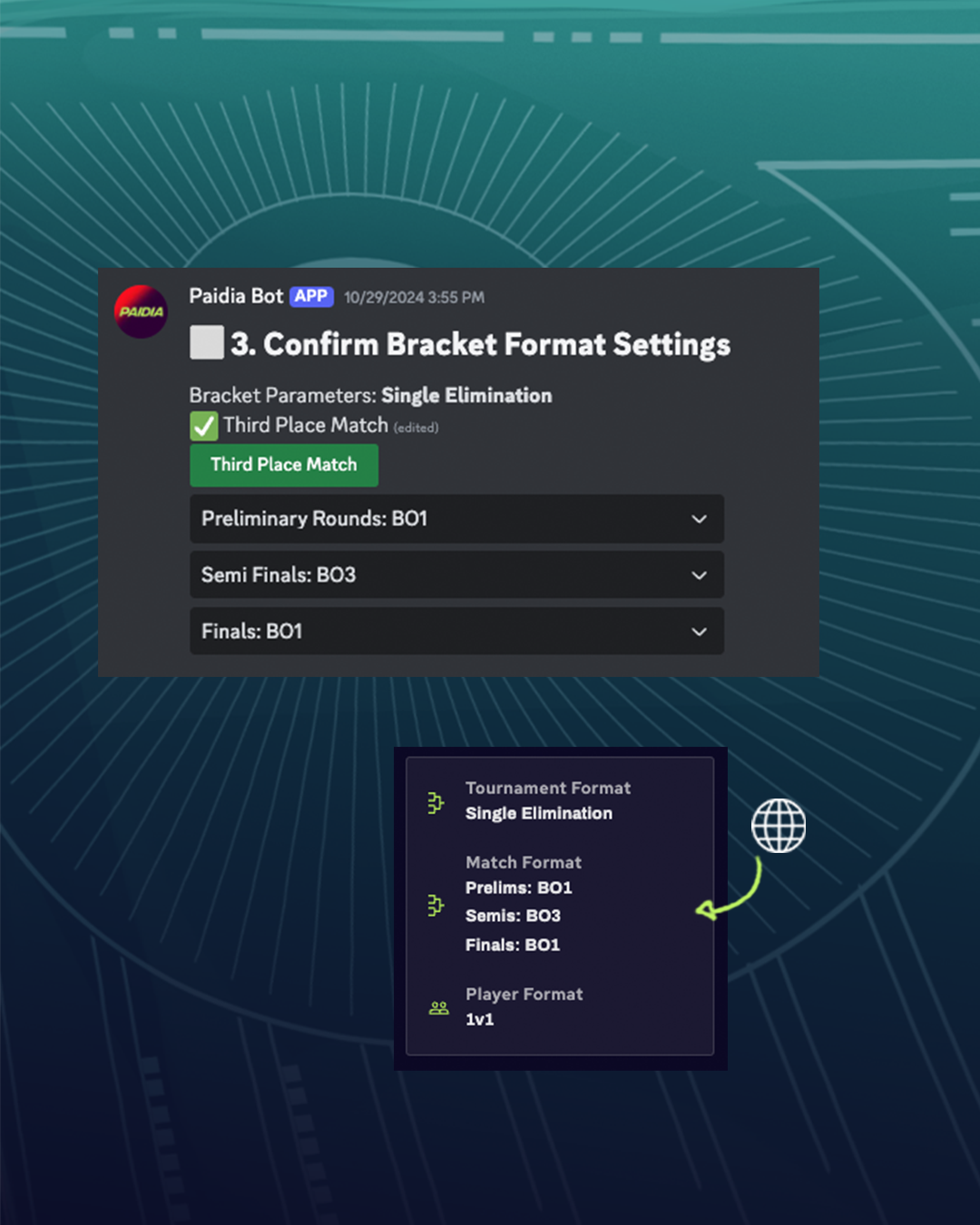 - Your selection of custom formats will be displayed on your tournament page and #bracket channel